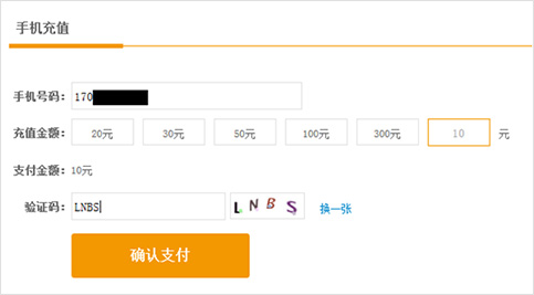 2、页面跳转至手机充值页面,请确认您的U.友170手机号,选择或输入充值金额,并填写验证码后,点击"确认支付"按钮。